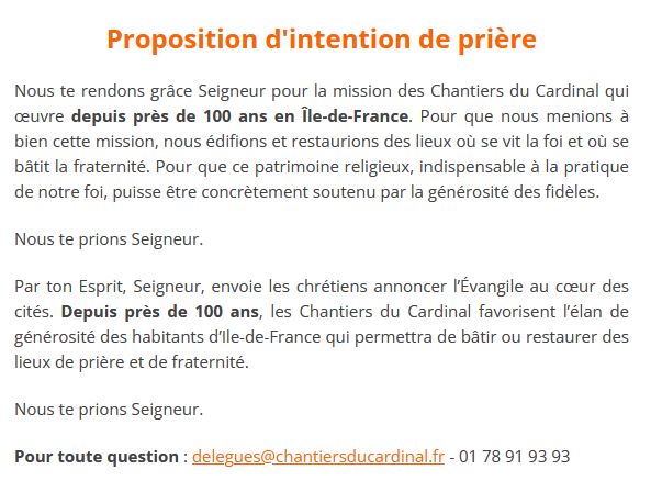 D’avance, merci à tous pour votre générosité fidèle ou naissante, en soutien à l’œuvre des Chantiers du Cardinal (don possible en ligne ou par chèque à l’ordre des Chantiers du Cardinal dans l’enveloppe qui vous a été remise à l’entrée ou disponible au fond de l’église). Et vous pouvez découvrir dès à présent les actions menées, en cours et à venir au travers de leur revue et sur leur site internet www.chantiersducardinal.fr.